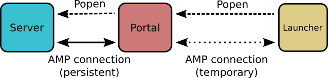Here I've excluded connections irrelevant to reloading, such as the Twisted AMP connection between Portal and Server. Dashed lines suggest a more "temporary" connection than a solid line.