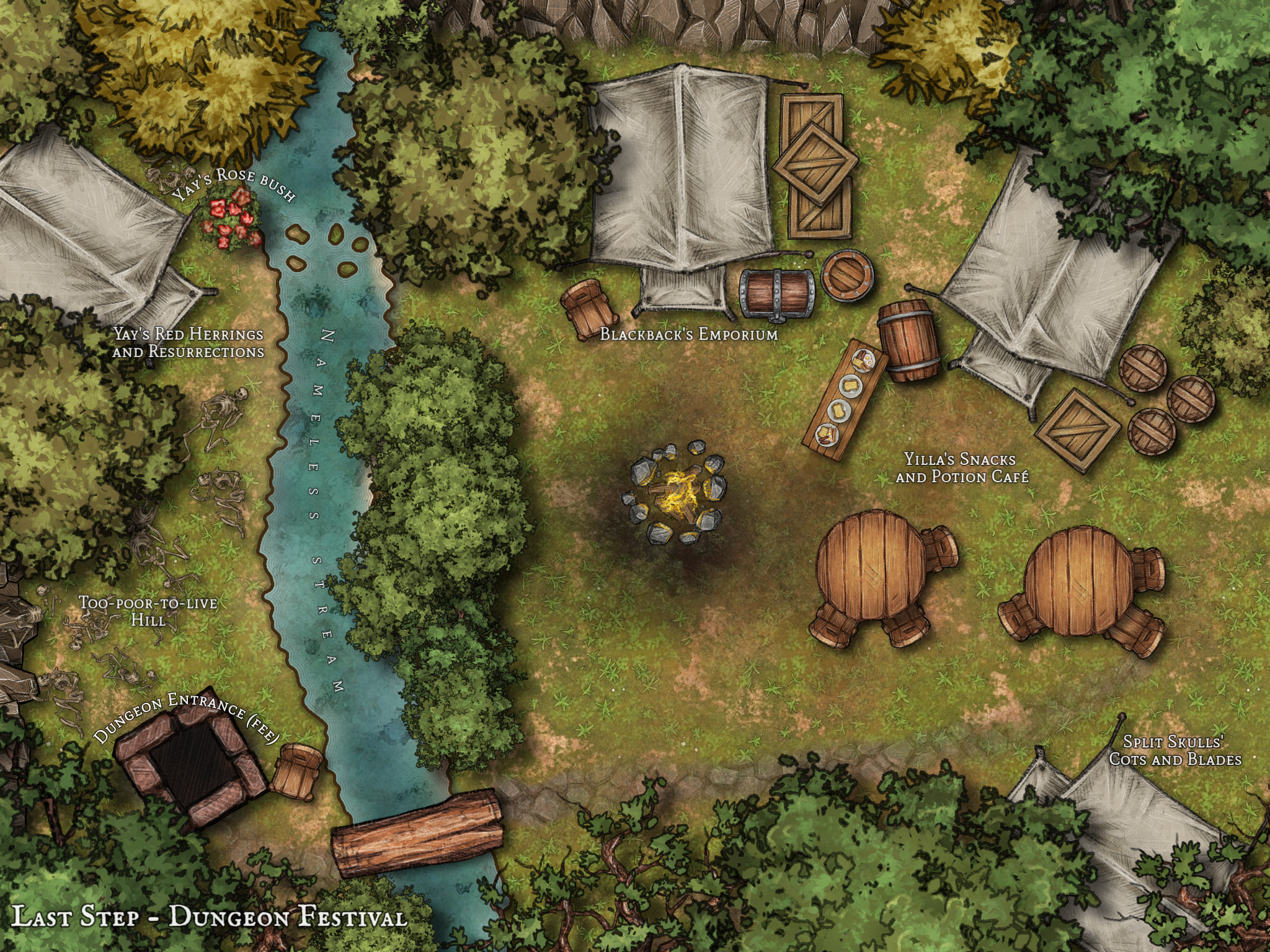 Here’s an overview of the topside camp for inspiration (quickly thrown together in the free version of Inkarnate). We’ll explore how to break this up into “rooms” (locations) when we get to creating the game world later.